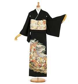 留袖(黒留袖)は、最も格が高い既婚女性の第一礼装です。留袖は、新郎新婦のお母さまや、ご親族さまがご着用になれるもので、5つの染め抜き紋が施されております。